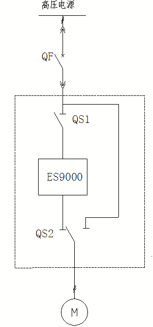 一拖一手动旁路柜包含两个隔离刀闸QS1、QS2及相关保护电机设备。正常运行时,变频器拖动电机运行,当变频出现故障时,可断开电机变频控制回路,合闸工频回路,即可保持生产持续运行;旁路柜中QS1、QS互锁,当QS1合闸时,QS2不能合闸至工频侧,保证电路回路操作安全、可靠。